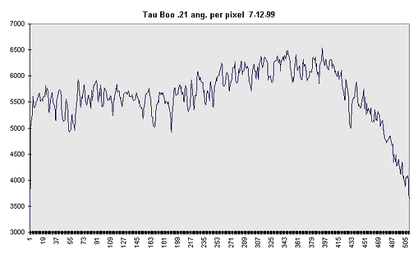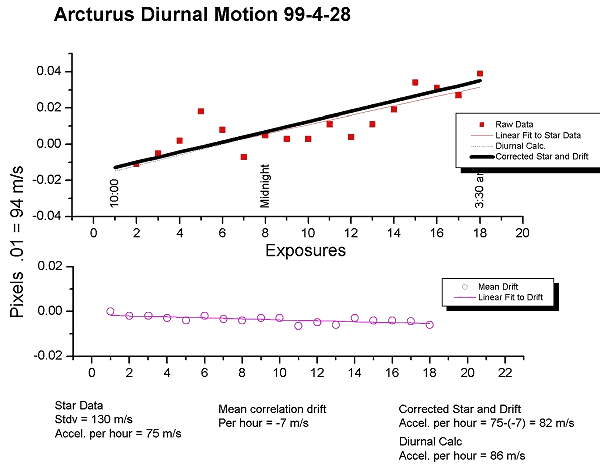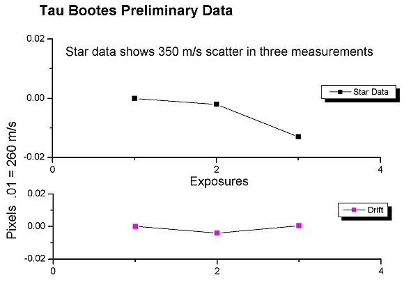 Most of the observing time has been spent on Arcturus doing sequential exposures from dusk to 3:00 am trying to detect diurnal motion. This is a shift in velocity through the night of about 500 meters per second due to earth’s rotation. The observing is scheduled as follows: the system is cooled down for 24 hours before the run and about 10 hours before dusk, the Thorium Argon lamp is injected down all the fibers to expose reference frames continuously right up to the switch to Arcturus. The star is tracked all night, taking exposures every 10 minutes, and at the end of the run the system is put back on the reference lamp exposures for another 6 to 7 hours. The following graph shows preliminary results for the first good run (we have been having a lot of bad weather). In the graph below, .01 pixels is equal to 90 meters per second velocity.