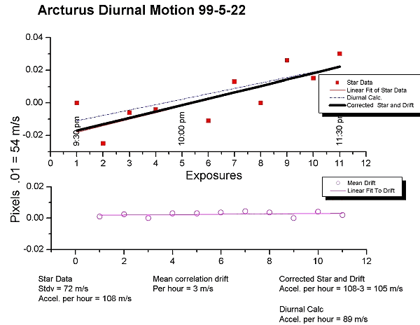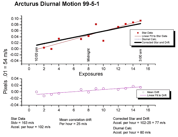 All spectrographs experience mechanical flexure from thermal and other changes. This can be quantified by monitoring a reference lamp during the course of the observations – for the data presented here, this monitoring takes place at the same time as the star is being observed. There are three fiber beams, one for the star and two for the reference lamp. The beam paths do not progress identically through the system, and hence mechanical flexure or pressure changes can cause slightly different shifts in the reference and star beam paths, and hence differential shifts of the final spectra on the CCD. Some of this effect can be corrected by noting the difference in the drift as measured by fiber 1 and fiber 2. Halving this difference gives the correction, a quantity we term “correlation drift,” to be applied to the “red square” data for a second order correction. The “correlation drift” is shown in the lower panel of each graph. The heavy black line is the linear fit to the star data with the correlation drift (from the lower panel) subtracted, and represents the “best estimate” of the change in the star’s velocity over the night. The blue dotted line represents the mathematical calculation for the velocity shift, as shown in the Arcturus diurnal motion graph. The difference in gradient (in m/s per hour) between the heavy black and the dotted blue lines is a measure of the error in the measurements. The lines have been arbitrarily shifted vertically so they cross at the point during the night when the star was on the local meridian, and hence shows zero diurnal velocity shift.