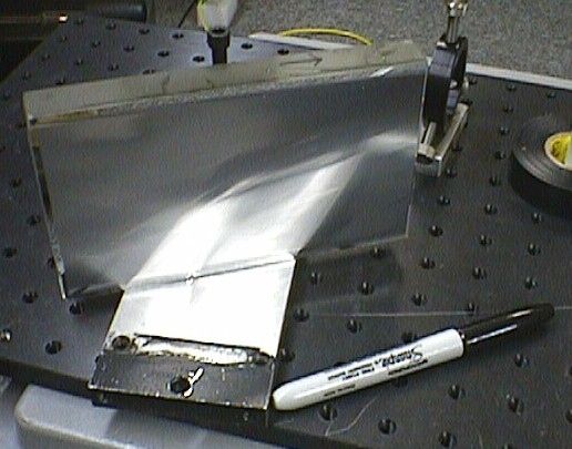 We have purchased a first quality grating from Diffraction Products in Woodstock, IL. A grating is the business end of every high-performance spectrograph and is used to disperse the spectrum. Dr. Ed Liebhard ruled a new master grating for us (280,000 lines) over two weeks. The current gratings are two inches square and are trying to reflect a three-inch beam, so a significant amount of light is lost at the edges. This new grating will capture all the light from the collimator, further improving efficiency. Dr. Liebhard was also kind enough to make us a special deal on the Echelle grating seen below.
