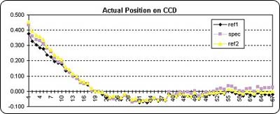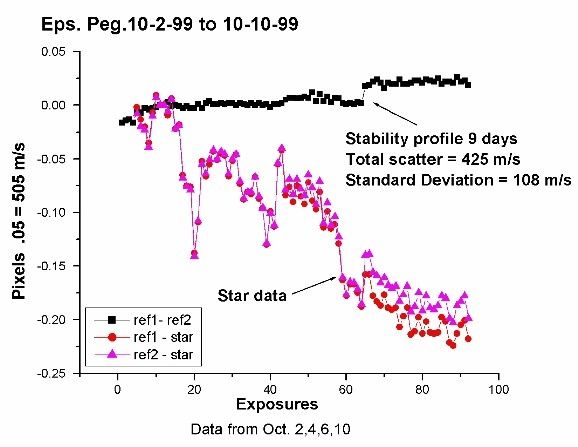 Until recently we have been working on efficiency and resolution issues. The graph at left is our first multi-day test for total drift. We utilize a cross-correlation technique that compares the first exposure to all the rest and tells you how much subsequent spectrums have moved relative to the first.