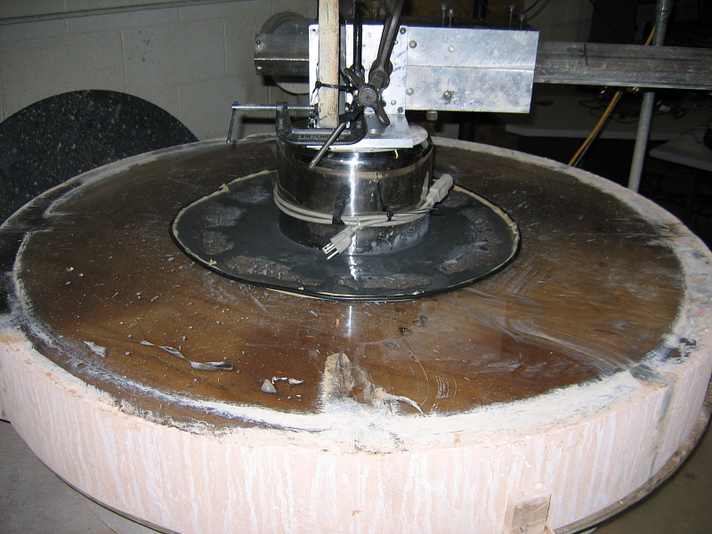 The mirror was lifted from the grinding machine for the first time in 5 years and flipped. We bored a 10″ diameter hole in the back using a stainless cooking pot and abrasive. The cut was made 80% of the way through the mirror to relieve stress before final figure.