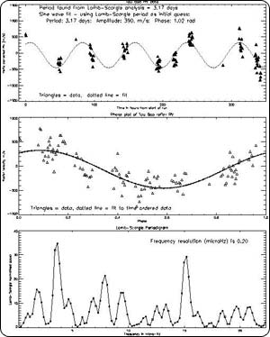 This is the second independent evaluation done by professional astronomer John Innis in Tasmania. He used the Lomb-Scargle routine in IDL to determine the most significant periodicity in the data (=3.2 days), and then used this as input into a least-squares sine wave fit to produce the fitted curve shown. Here we see the data plotted as daily observations with the best fit sine wave in the top box. The middle box holds the data phased about a single orbit. The lower box is a power spectrum which shows a strong peak at the frequency most represented in the data. We have never met John but want to thank him for taking an interest in amateur astronomy halfway around the world.