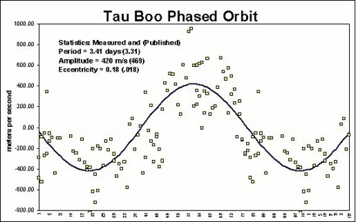 In February of 2000 we took our telescope and spectrograph to Arizona with the goal of detecting the known extrasolar planet around the star tau Boo. After a three week struggle with bad weather and a defective grating, we came up with enough data to resolve the planets orbit. The plots below show the data in various configurations from this run. We believe this was the first radial velocity detection of an extrasolar planet by amateurs.