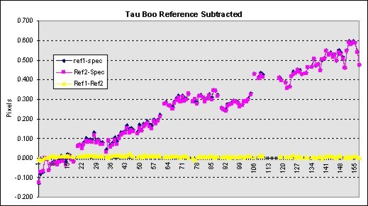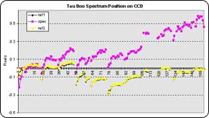 This shows the unprocessed positions of the different spectrums on the CCD. There are non-random trends in the reference spectrums from each night’s startup which are minimized by running test exposures for several hours before the run.