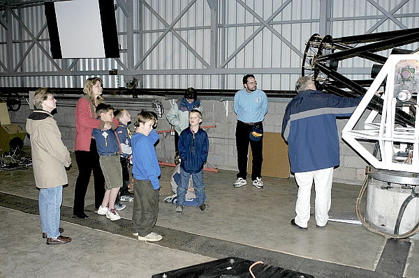 Day Four Monday Rain and clouds during the day, cleared early evening. Got the telescope on a star for the first time this trip. Made multiple adjustments to the guider and pick-off mirror. Still needed to align the star on the science fiber when the clouds and rain came in and we closed up early. Pro astronomer Jonathan Lunine brought the Boy Scouts by today for a tour of the observatory and the spectrograph.